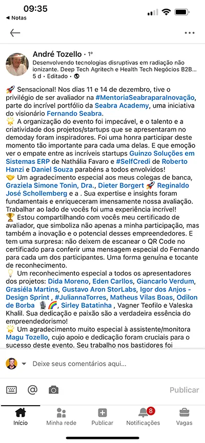 Fernando Seabra, com sua vasta experiência e conhecimento, fornecerá feedback personalizado a cada grupo participante, destacando pontos fortes e oportunidades de aprimoramento.
